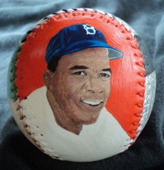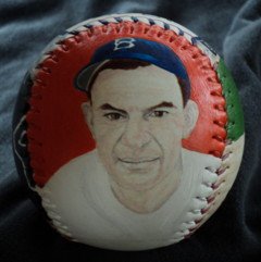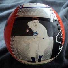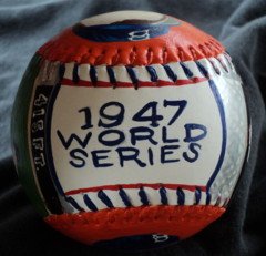 Side five, which is the top of the baseball, has "1947 WORLD SERIES" hand painted in Dodgers colors.