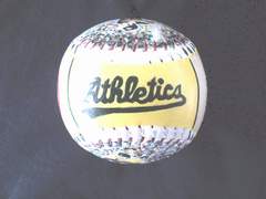 Side five, which is the top of the baseball, has my hand painted "Athletics" in team colors as the winners.