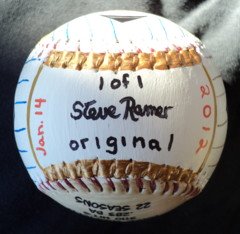 Side six, which is the bottom of the baseball, has my signature along with the date that this Legends Hand Painted Baseball was completed and trimmed with gold. Also you will see "1 of 1". This means that this is number one of only one created. This is a one of a kind piece of art. There will never be another exactly like it. #30006