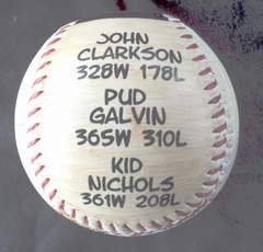 This Great American 300 Wins Baseball features three of my original paintings. A certificate of authenticity comes with your baseball so that you know it's an original Great American Baseball.This Baseball Is Available Side one is my close up painting of Kid Nichols who finished with 361 wins. Click here for a closer look.