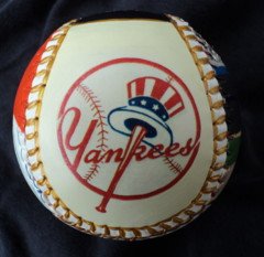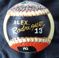 Side five, which is the top of the baseball, has "Alex Rodriguez" hand painted name in Yankees colors.