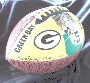 This Legends Hand Painted Bart Starr Mini Football features my original paintings of the Green Bay Packers Hall Of Famer. This Football Has Been Sold The center of this nine inch long football has my two paintings of Bart Starr with the Lambeau Field crowd in the background. Click here for a closer look.