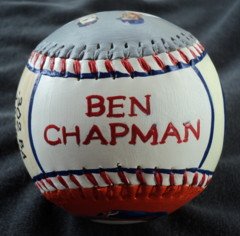 Side five, which is the top of the baseball, has "Ben Chapman" hand painted in Phillies colors.