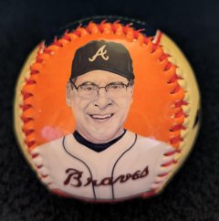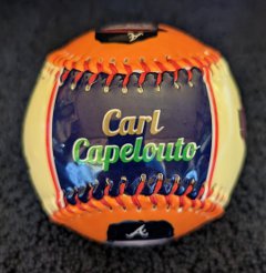 The top of the baseball has "Carl Capelouto"in Braves Colors.