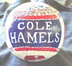 Side five, which is the top of the baseball, has Cole Hamels' hand painted name.