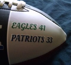 The back side of the football has my hand painted Superbowl 52 logo. Click here for a closer look.
