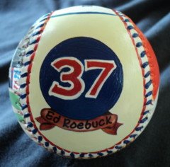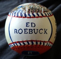 Side five, which is the top of the baseball, has "Ed Roebuck" hand painted in Dodger colors.