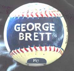 Side five, which is the top of the baseball, has George Brett's hand painted name in Royal's colors.