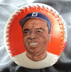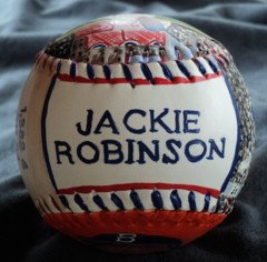 Side five, which is the top of the baseball, has "Jackie Robinson" hand painted in Dodgers colors.