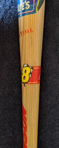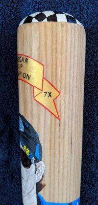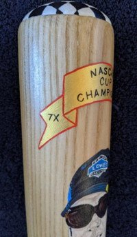 Side one has my portrait painting of Jimmie Johnson. Checkered flag surrounds the top of the bat. Click here for a closer look