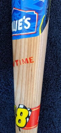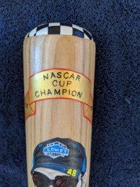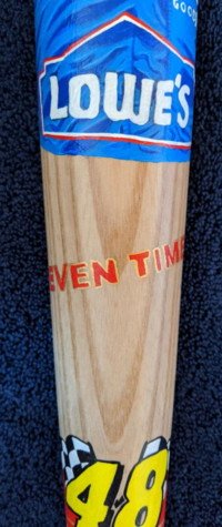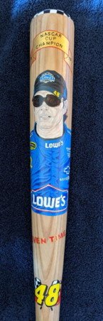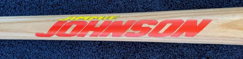 "JIMMIE JOHNSON" is painted "two toned" along the handle of the bat.