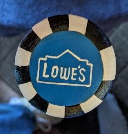 The knob of the bat is painted blue with the LOWE"S logo on the bottom.