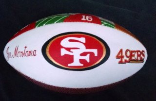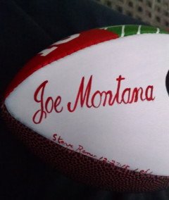 The left side has Joe Montana's hand painted name. Also, my signature and the date this football was completed.
