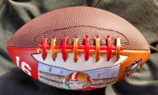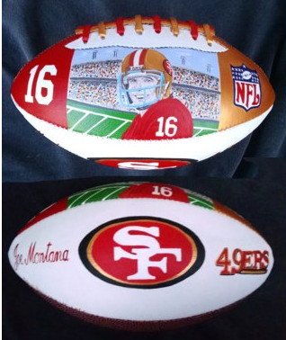 The top side of the football has my painting of Joe Montana with Candlestick Park in the background. Click here for a closer look