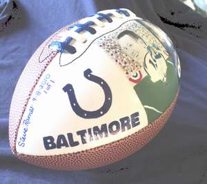 The left side has the famous Balitmore Colts horse shoe logo, with BALTIMORE below. Along the top is my signature and the date this football was completed. You can also see after the date, 1 of 1. This means that this is number 1 of only 1 created. This is a one of a kind piece of art. There will never be another exactly like it. $225.00#juf