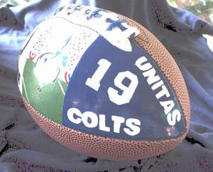 This Legends Hand Painted Johnny Unitas Mini Football features my original paintings of the Baltimore Colts legendary quarterback. This Football Has Been Sold The center of this nine inch long football has my two paintings of Johnny Unitas with the Baltimore crowd in the background. Click here for a closer look.
