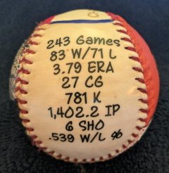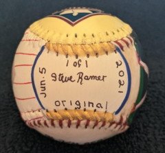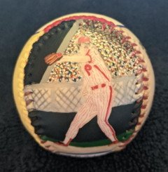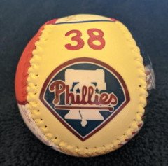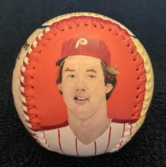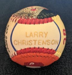 Side five, which is the top of the baseball, has my hand painted "LARRY CHRISTENSON" in gold. Trimmed with Phillies colors.