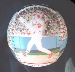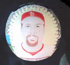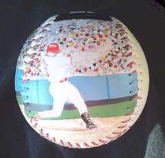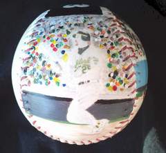This Great American Mark McGwire Baseball features four of my original paintings of Big Mac. A certificate of authenticity comes with your baseball so that you know it's an original Great American Baseball.This Baseball has Been Sold. Side one is my close up painting of Mark McGwire. Click here for a closer look.