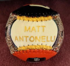 Side five, which is the top of the baseball, has "MATT ANTONELLI" painted in gold.