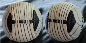 The bottom of the baseball, shows the belt line of Mickey's road uniform.