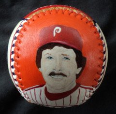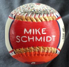Side five, which is the top of the baseball, has "Mike Schmidt" hand painted in Phillies colors.