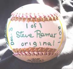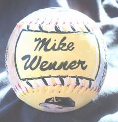 Side five, which is the top of the baseball, has Mike's hand painted name in team colors.
