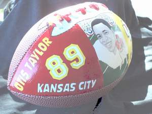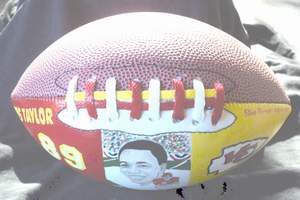 The left side of the football has Taylor's hand painted number 89, along with his name along the top and "KANSAS CITY" along the bottom.