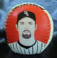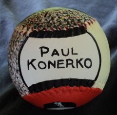 Side five, which is the top of the baseball, has "Paul Konerko" hand painted in White Sox colors.