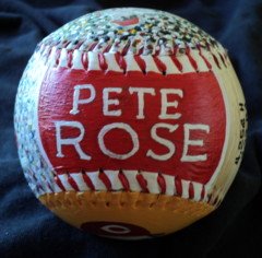 Side five, which is the top of the baseball, has "Pete Rose" hand painted in Reds colors.