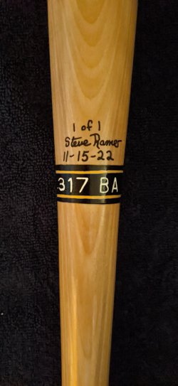 The back of the bat has Roberto's lifetime batting average. Also my signature, the date this bat was completed and 1 of 1.