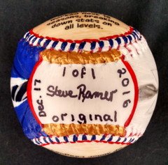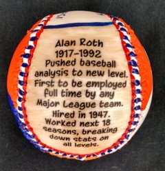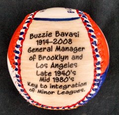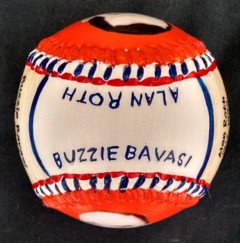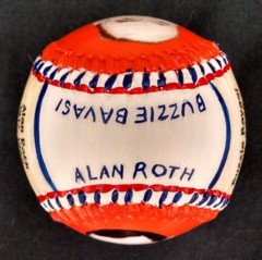 Side five, which is the top of the baseball, has my hand painted ALAN ROTH and BUZZIE BAVASI facing their paintings.