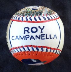 Side five, which is the top of the baseball, has has "Roy Campanella" hand painted in Dodger colors.