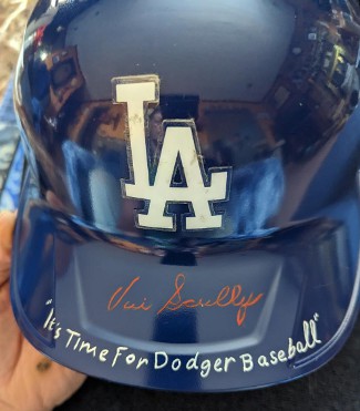 "It's Time For Dodger Baseball". And Vin Scully's simulated autograph.