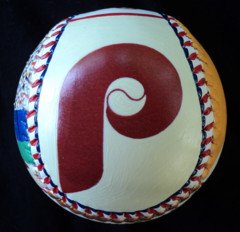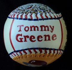 Side five, which is the top of the baseball, has "Tommy Greene" hand painted in Phillies colors.