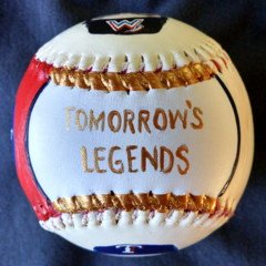 Side five, which is the top of the baseball, has TOMORROW'S LEGENDS hand painted in gold.
