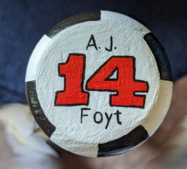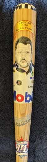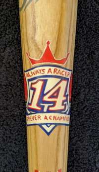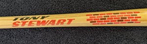The handle of the bat has Tony Stewart's name and a row of Indianapolis 500 bricks.