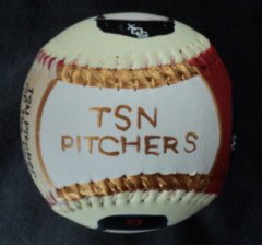 Side five, which is the top of the baseball, has TSN PITCHERS painted in gold.
